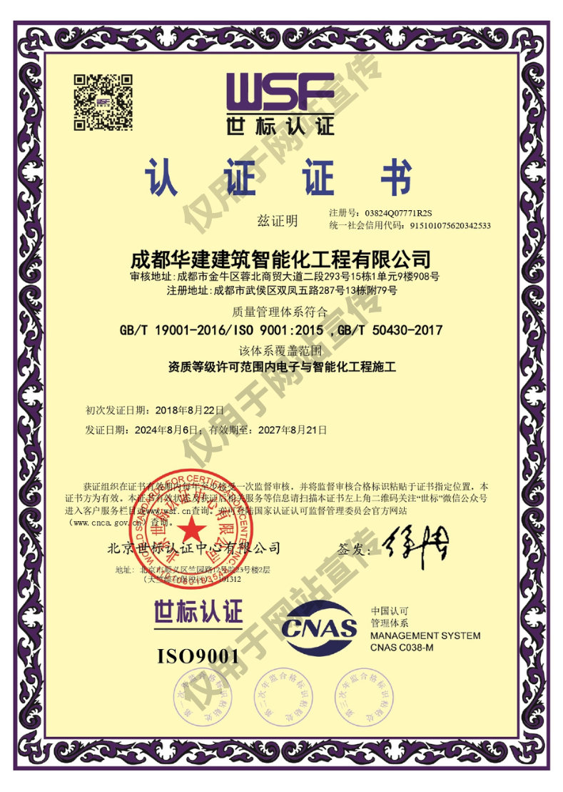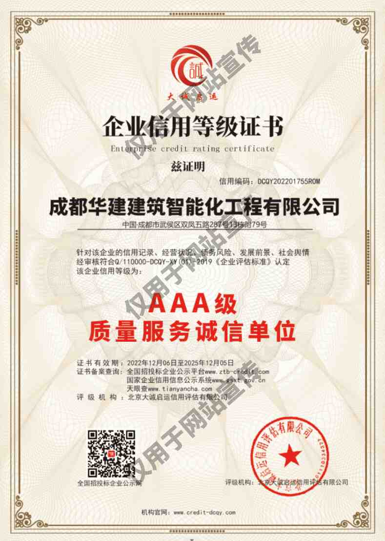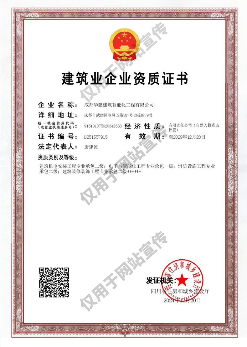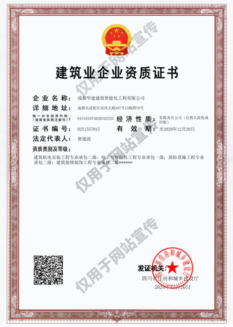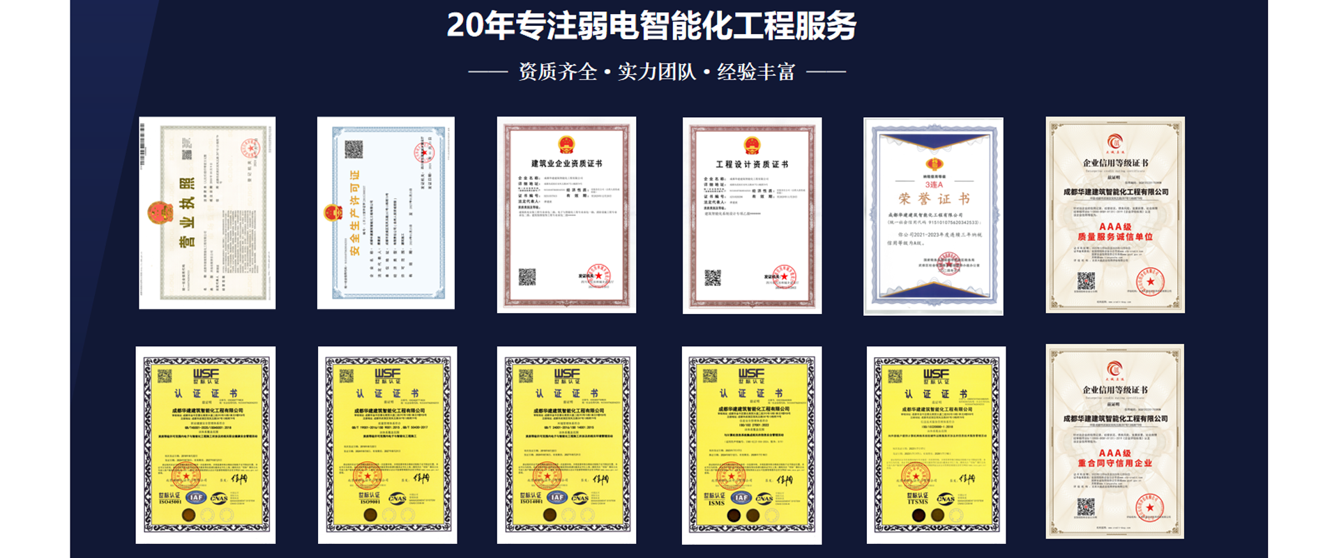 成都華建建筑智能化工程有限公司,19年專注弱電智能化工程、消防工程、建筑機(jī)電安裝工程的專業(yè)公司,具備電子與智能化工程、消防設(shè)施工程、建筑機(jī)電安裝、建筑裝修裝飾、建筑智能化設(shè)計(jì)等相關(guān)30余項(xiàng)資質(zhì)及證書。設(shè)計(jì)、施工和維保一站式服務(wù),多行業(yè)中大型成功交付案例?!?
